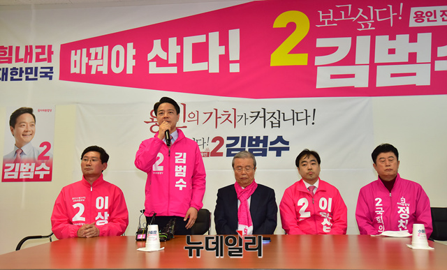 김범수 미래통합당 용인정 후보가 2일 오후 경기 용인시 용인정 선거사무소를 격려방문한 김종인 총괄선대위원장과의 간담회 자리에서 인사말을 하고 있다. (경기 용인=정상윤 기자)