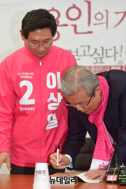 [포토] 김종인 선대위원장 저서에 사인받는 이상일 후보