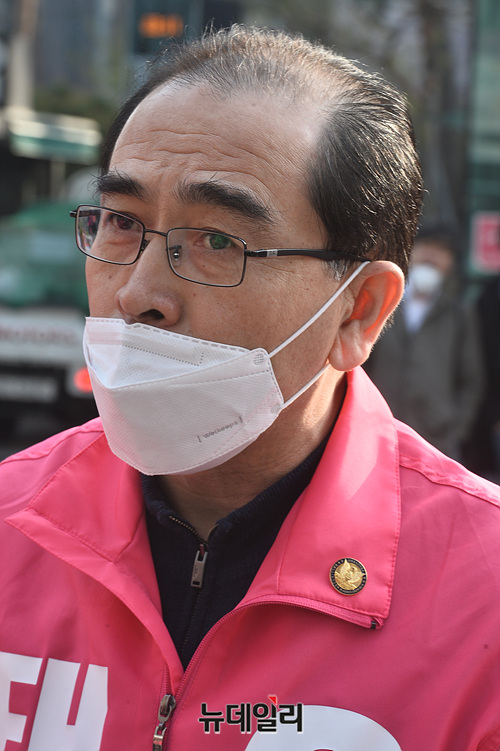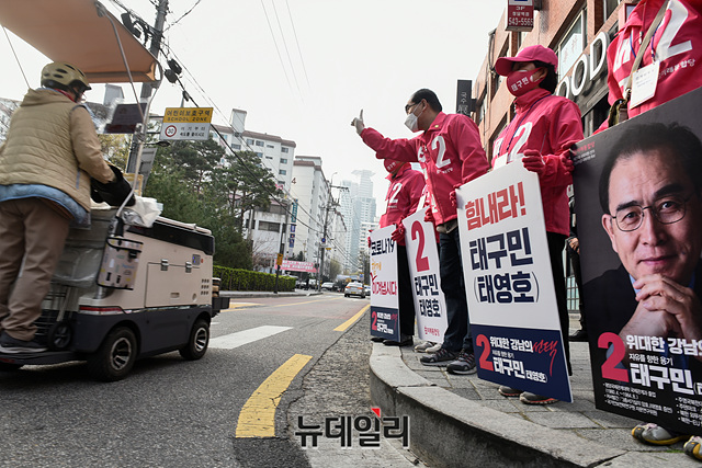 태구민(태영호) 미래통합당 서울 강남갑 후보가 3일 오전 서울 강남구 청담지아 입구에서 출근하는 시민들에게 지지를 호소하고 있다.
