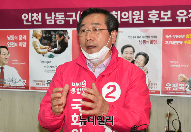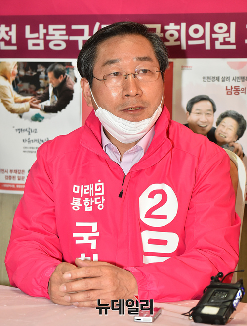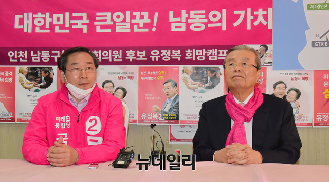 유정복 미래통합당 21대 총선 남동갑 후보가 3일 오전 인천 남동구 본인의 선거 사무실을 찾은 김종인 미래통합당 총괄선대위원장의 격려사에 답하고 있다. (인천=이종현 기자)