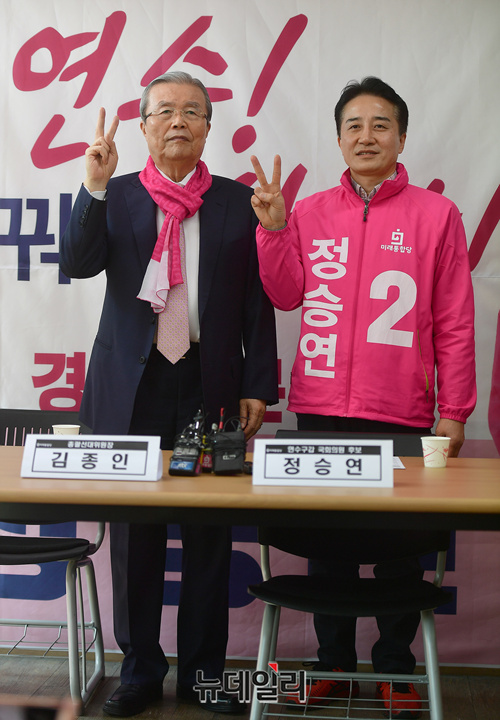 정승연 미래통합당 인천 연수갑 후보가 3일 오후 인천 연수구 본인의 선거사무소를 찾은 김종인 총괄선대위원장과 기념촬영을 하고 있다. (인천=정상윤 기자)
