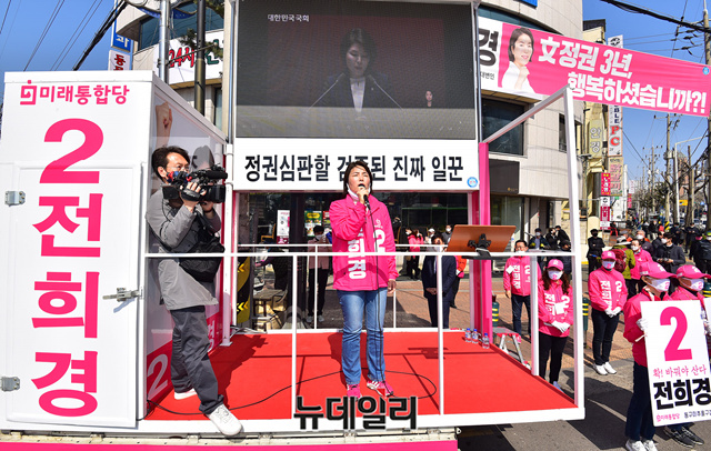 전희경 미래통합당 인천 동구미추홀구갑 후보가 3일 오후 인천 미추홀구 신기시장사거리에서 지지호소를 하고 있다. 이날 김종인 총괄선대위원장과 홍일표 의원이 지원 유세에 나섰다. (인천=정상윤 기자)