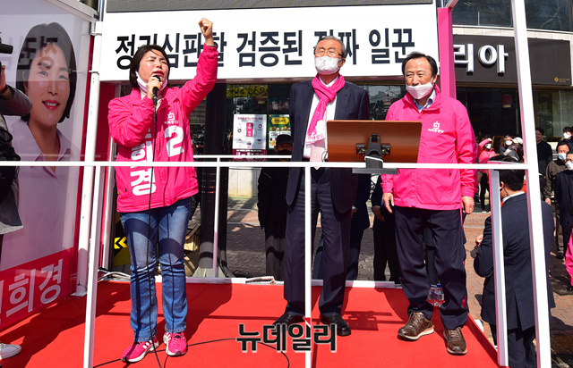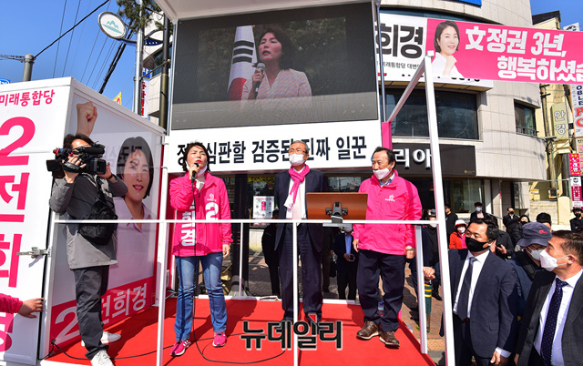 김종인 미래통합당 총괄선대위원장이 3일 오후 인천 미추홀구 신기시장사거리를 방문해 전희경 인천 동구미추홀구갑 후보 지원유세에 나섰다. 지역구 홍일표 의원도 지원유세에 함께 했다. (인천=정상윤 기자)