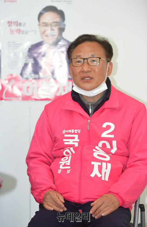 이중재 미래통합당 인천 계양갑 후보가 3일 오후 인천 계양갑 선거사무소를 격려방문한 김종인 총괄선대위원장에게 인사말을 하고 있다. (인천=정상윤 기자)