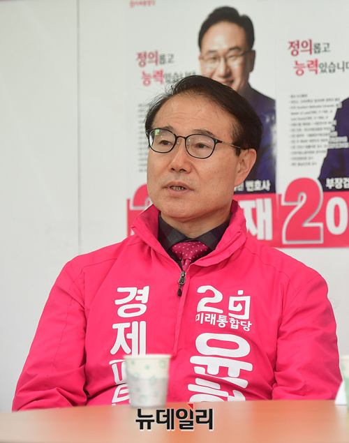 윤형선 미래통합당 인천 계양을 후보가 3일 오후 인천 계양갑 선거사무소를 격려방문한 김종인 총괄선대위원장에게 인사말을 하고 있다. (인천=정상윤 기자)