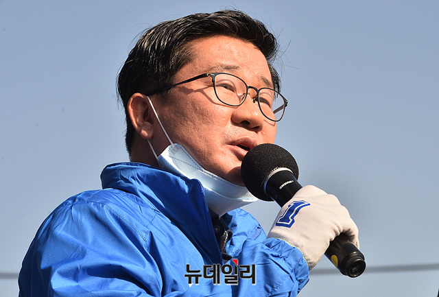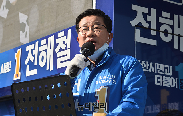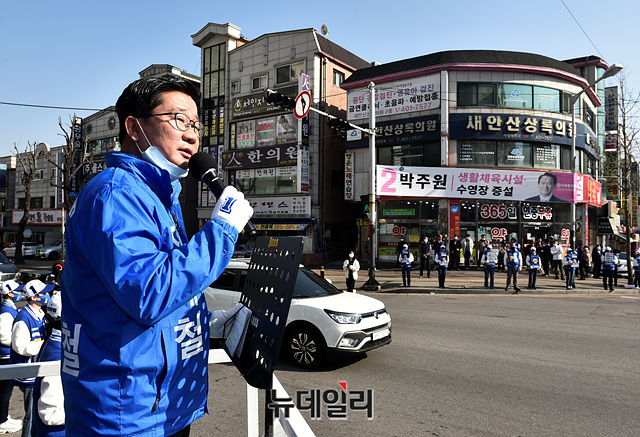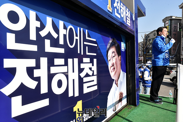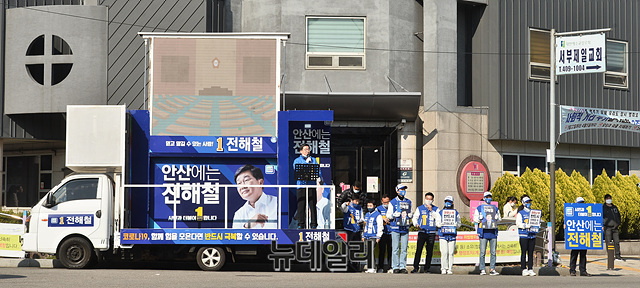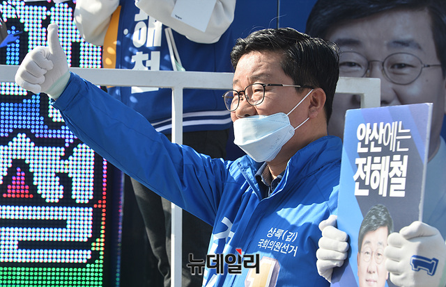 전해철 더불어민주당 경기 안산시상록구갑 후보가 3일 오후 경기 안산시 미즈피아 사거리에서 시민들에게 지지를 호소하고 있다. (경기 안산=박성원 기자)