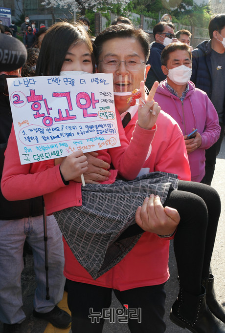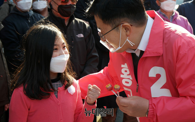 황교안 미래통합당 종로구 후보가 3일 오후 서울 종로구 혜화동 일대에서 어린이와 인사를 나누고 있다.