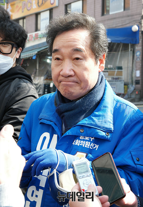 이낙연 더불어민주당 종로구 후보가 4일 오전 서울 종로구 명륜동 일대에서 선거 유세를 마친 뒤 취재진의 질문에 답하고 있다.