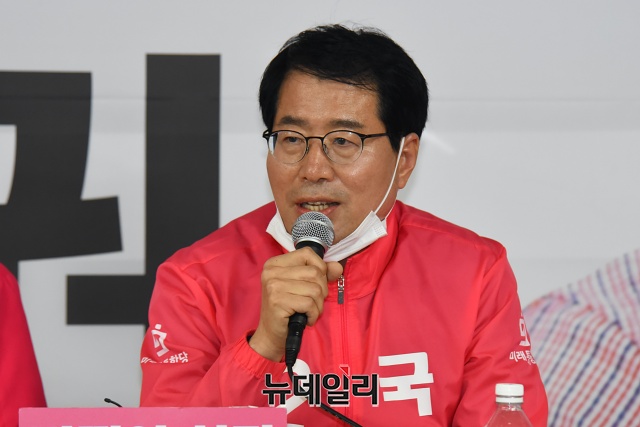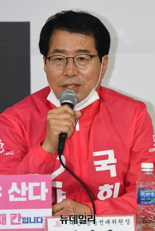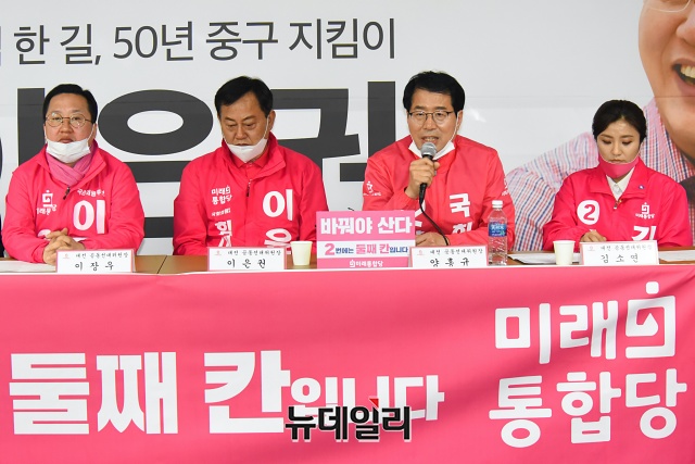 양홍규 미래통합당 대전 서구을 후보가 5일 오전 대전 중구 선거사무소에서 열린 대전 권역 선거대책위원회 회의에서 발언을 하고 있다. (대전=권창회 기자)