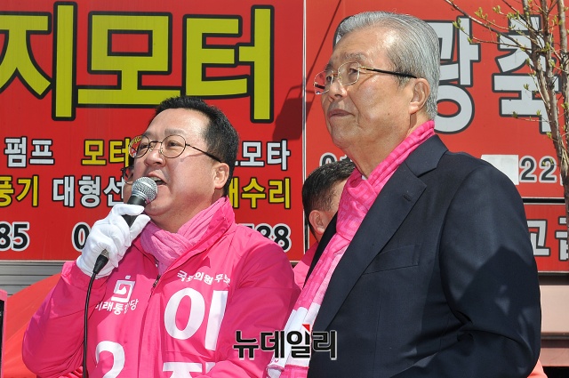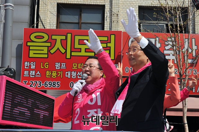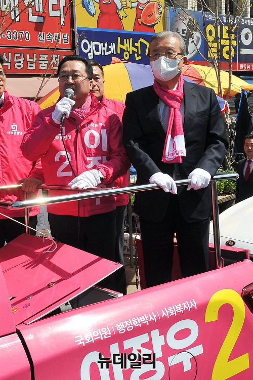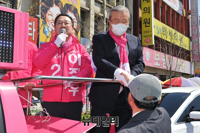 이장우 미래통합당 대전 동구 후보가 5일 오후 대전 동구 대전로 주변에서 김종인 선대위원장과 함께 인사말을 하고 있다. (대전=권창회 기자)