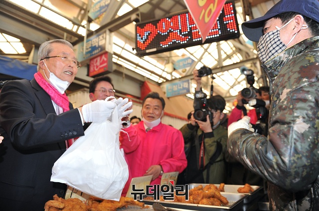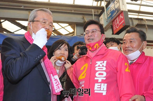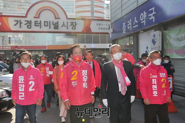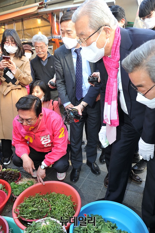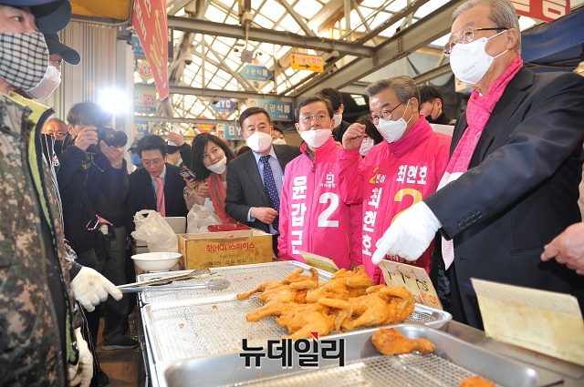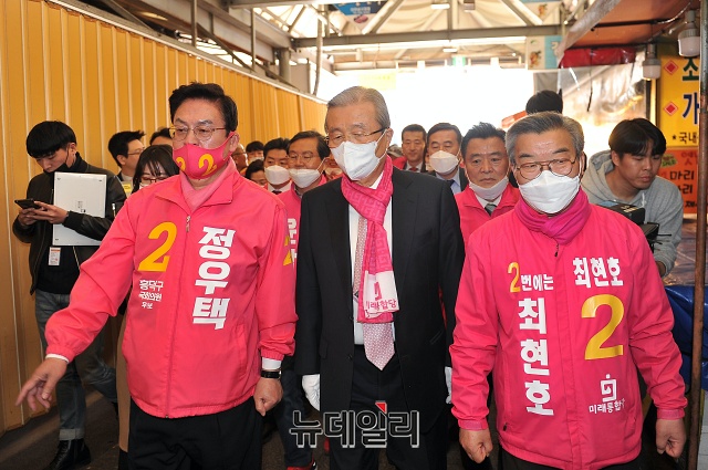 김종인 미래통합당 총괄선대위원장, 정우택 청주 흥덕구 후보, 최현호 청주 서원구 후보, 윤갑근 청주 상당구 후보가 5일 오후 충북 청주시 가경터미널시장을 방문해 선거유세를 하고 있다. (충북 청주=권창회 기자)