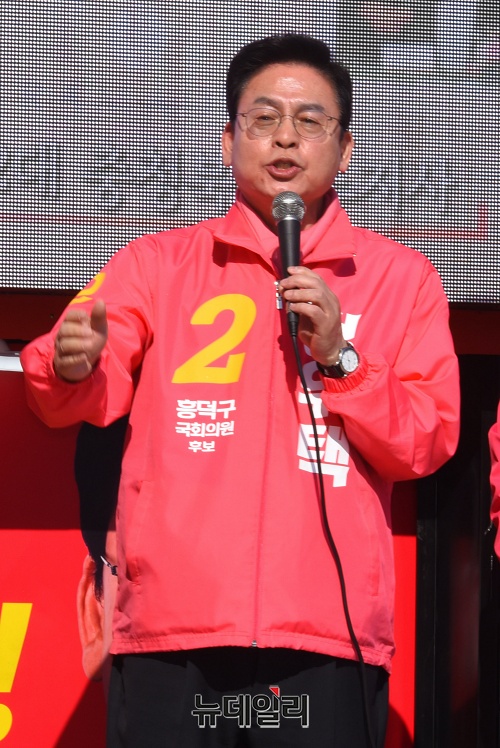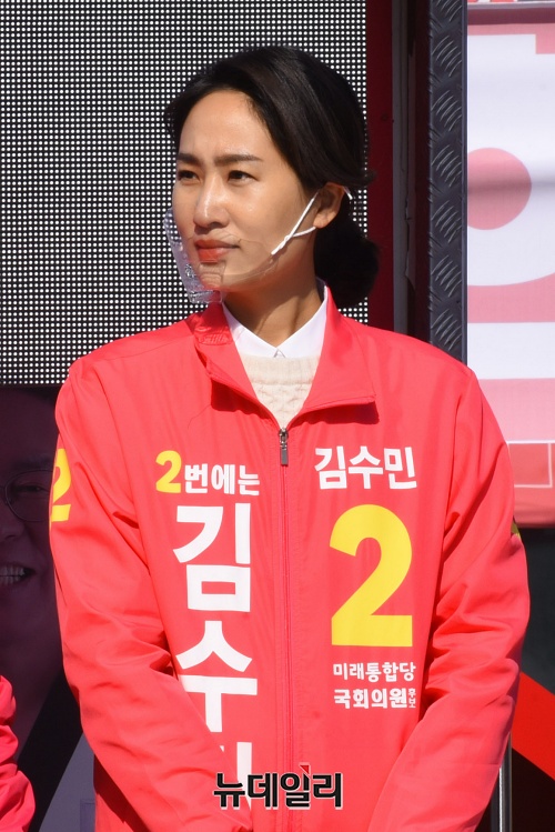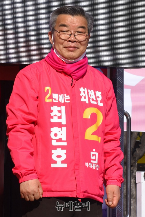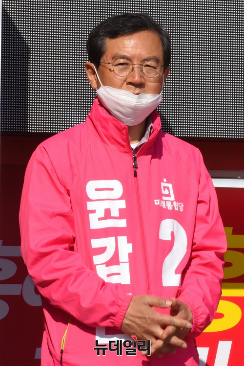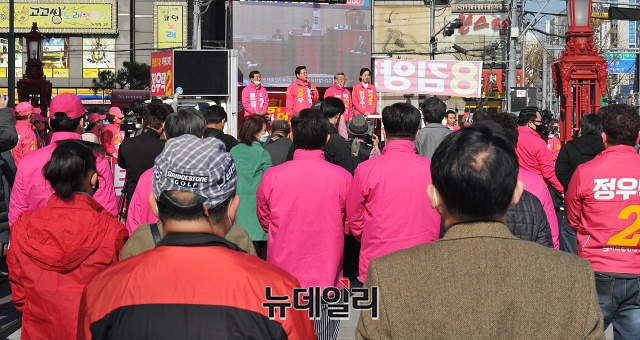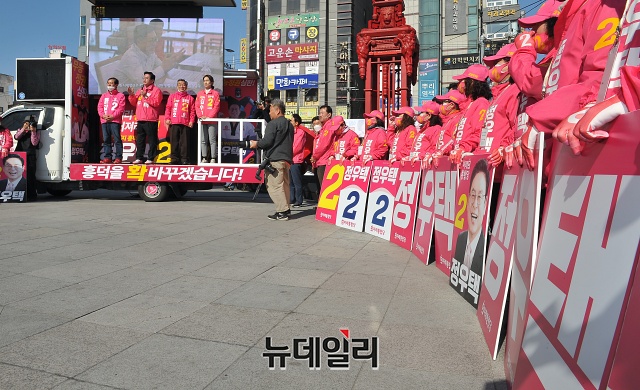 정우택 미래통합당 청주시 흥덕구 후보가 5일 오후 충북 청주시 풍산로 주변에서 윤갑근 청주 상당구, 최현호 청주 서원구, 김수민 청주 청원구 후보와 유세차량에 올라 선거유세를 하고 있다. (충북 청주=권창회 기자)