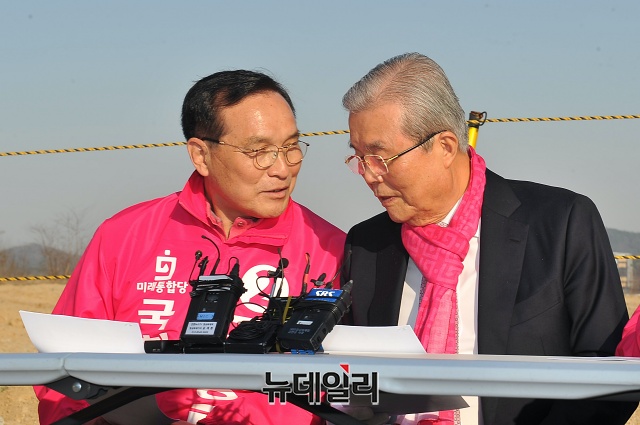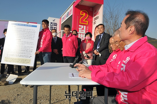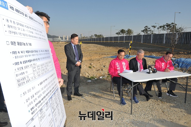 김종인 미래통합당 총괄선대위원장, 김중로 세종시갑 후보, 김병준 세종시을 후보가 5일 오후 세종시 어진동 세종국회의사당 예정 부지에서 국회 이전 관련 브리핑을 듣고 있다. (세종=권창회 기자)