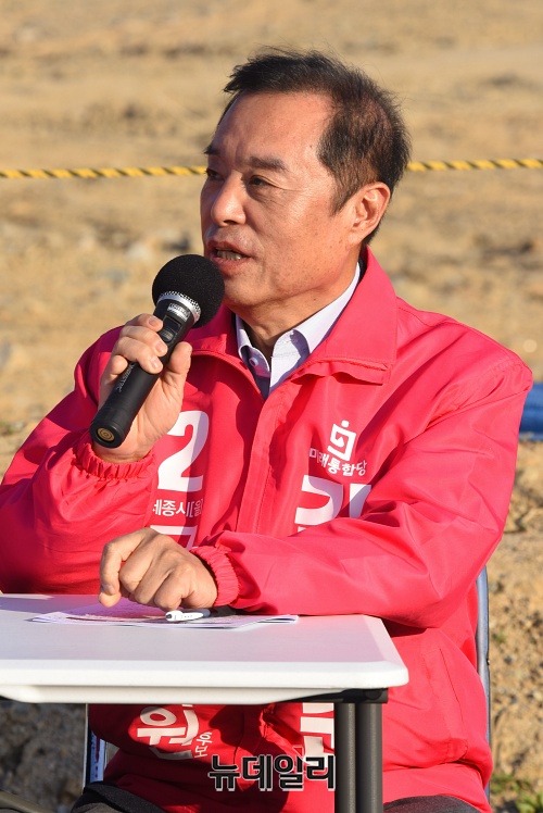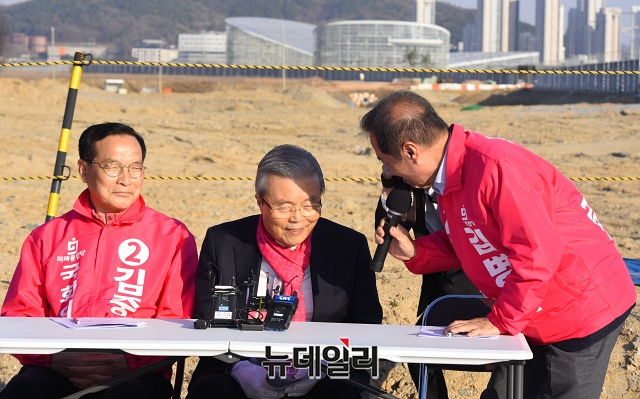 김병준 미래통합당 세종시을 후보가 5일 오후 세종시 어진동 세종국회의사당 예정 부지에서 지원유세 나온 김종인 선대위원장에게 감사 인사를 하고 있다. (세종=권창회 기자)