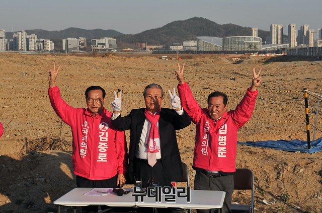 김종인 미래통합당 총괄선대위원장, 김중로 세종시갑 후보, 김병준 세종시을 후보가 5일 오후 세종시 어진동 세종국회의사당 예정 부지에서 기념촬영을 하고 있다. (세종=권창회 기자)