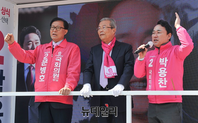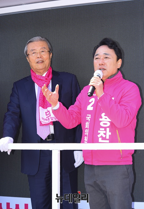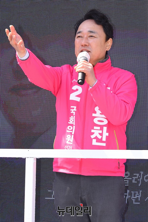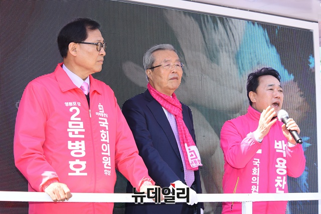 박용찬 미래통합당 영등포을 후보가 6일 오전 서울 영등포구 신길로 주변에서 지지호소를 하고 있다. 이날 유세장에는 김종인 총괄선대위원장이 지원 유세를 하기 위해 방문했다.