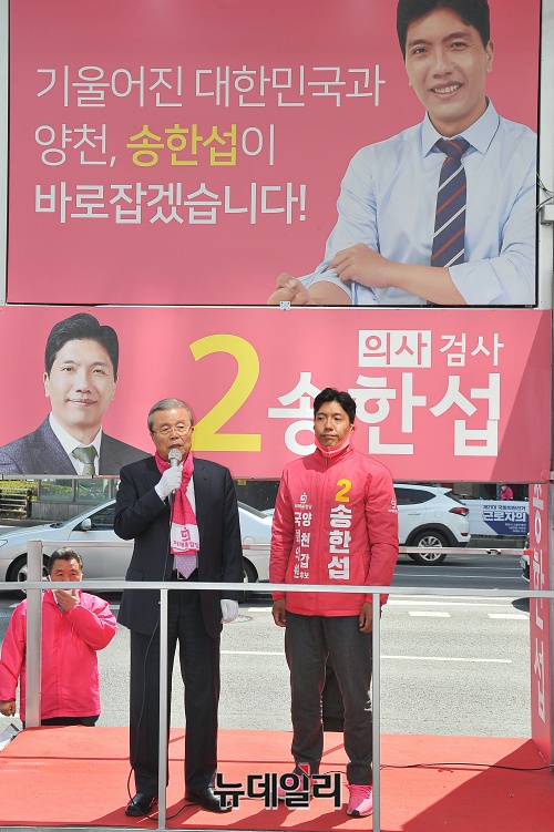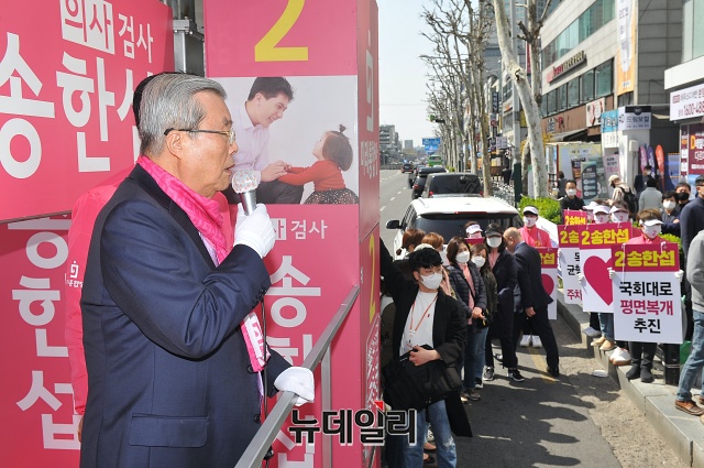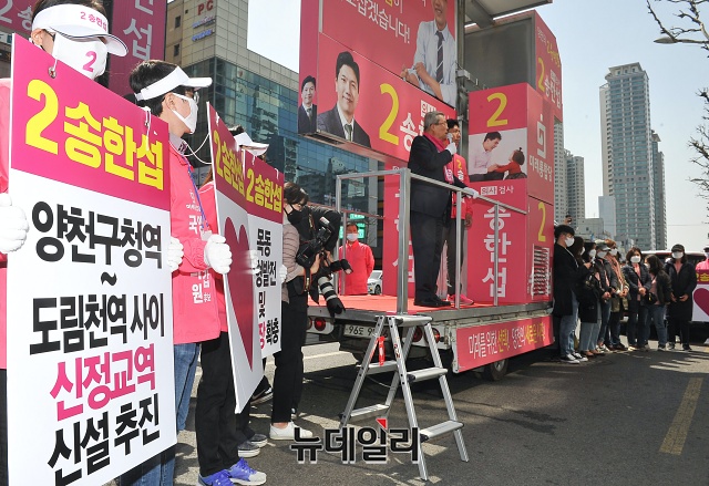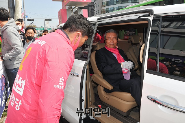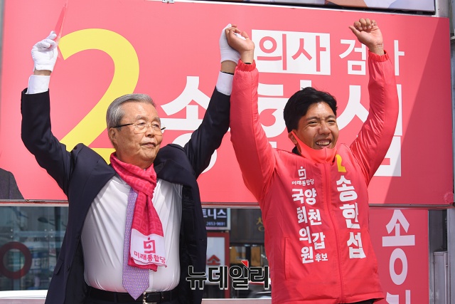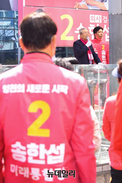 김종인 미래통합당 총괄선대위원장이 6일 오후 서울 양천구 오목로 주변에서 송한섭 양천갑 후보와 유세차량에 올라 지지를 호소하고 있다.
