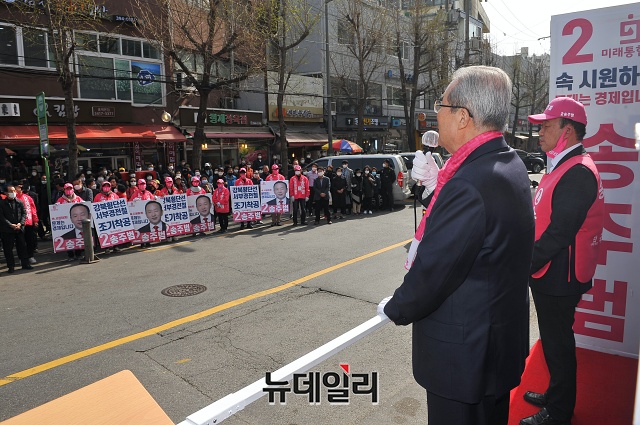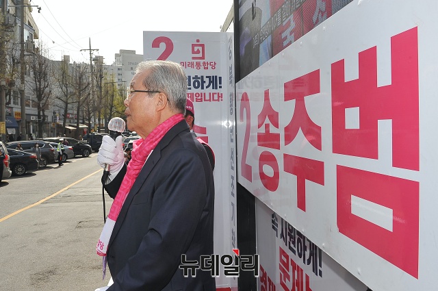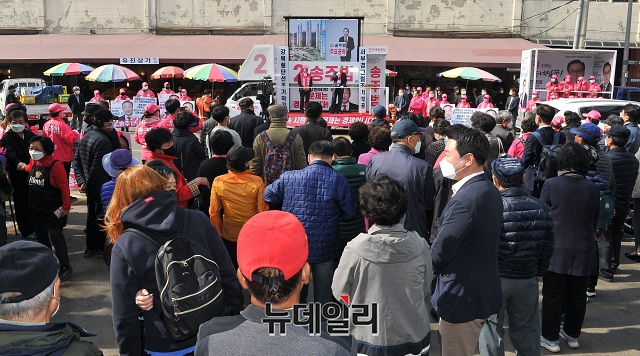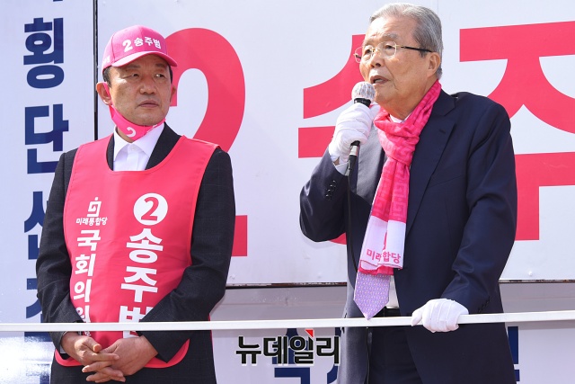 김종인 미래통합당 총괄선대위원장이 6일 오후 서울 서대문구 인왕시장 앞에서 송주범 서대문을 후보와 유세차량에 올라 총선 승리를 다짐하고 있다.
