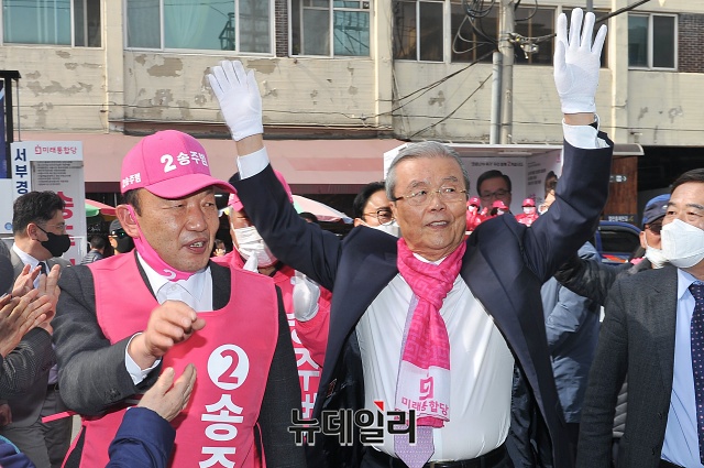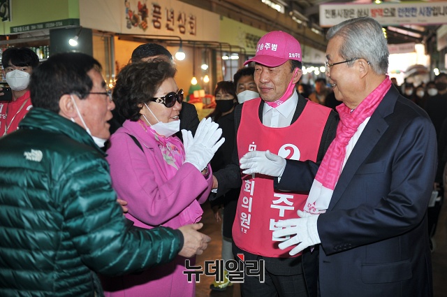 김종인 미래통합당 총괄선대위원장, 송주범 서대문을 후보가 6일 오후 서울 서대문구 인왕시장을 방문해 선거유세를 하고 있다.