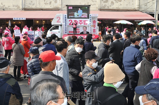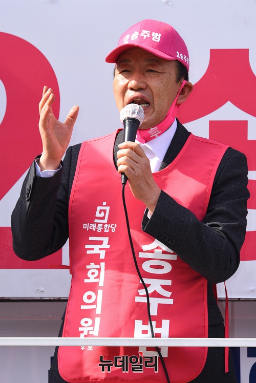 송주범 미래통합당 서대문을 후보가 6일 오후 서울 서대문구 인왕시장 앞 유세차량에서 총선 각오를 밝히고 있다.