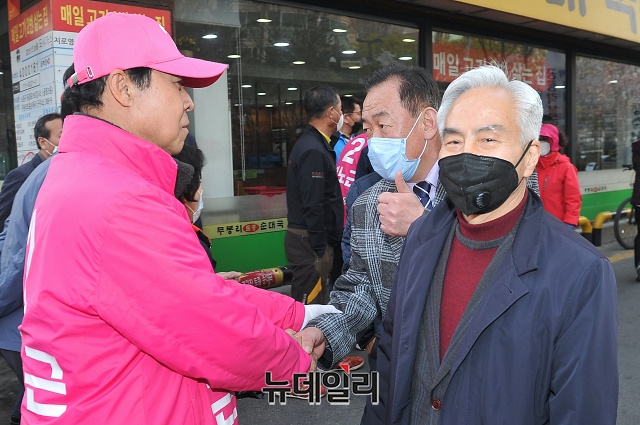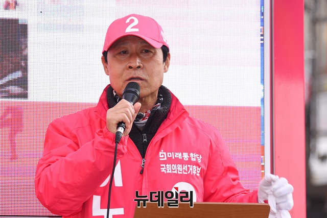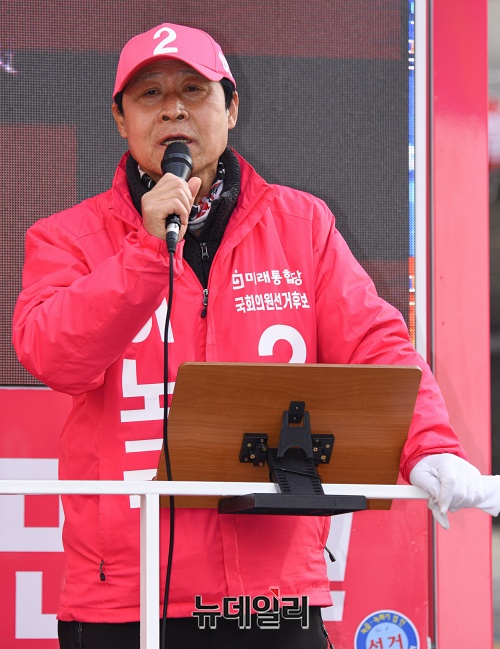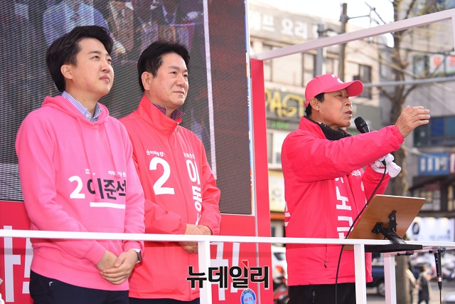 이노근 미래통합당 노원갑 후보가 6일 오후 서울 노원구 공릉동 인근에서 이동섭 노원을 후보, 이준석 노원병 후보와 유세차량에 올라 인사말을 하고 있다.