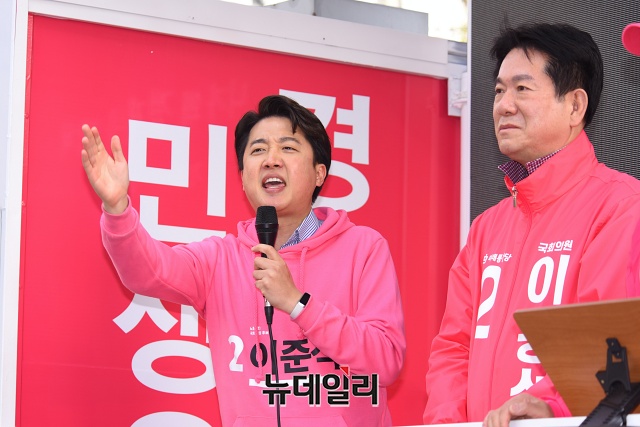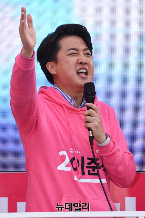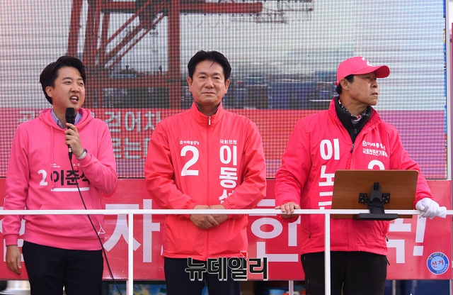 이준석 미래통합당 노원병 후보가 6일 오후 서울 노원구 공릉동 인근에서 이동섭 노원을 후보, 이노근 노원갑 후보와 유세차량에 올라 지지호소를 하고 있다.