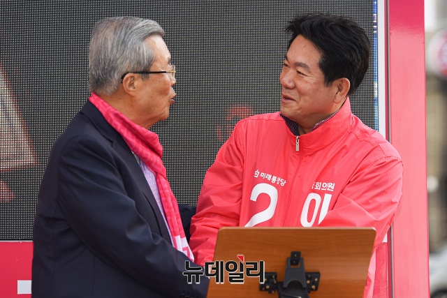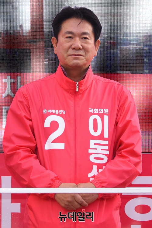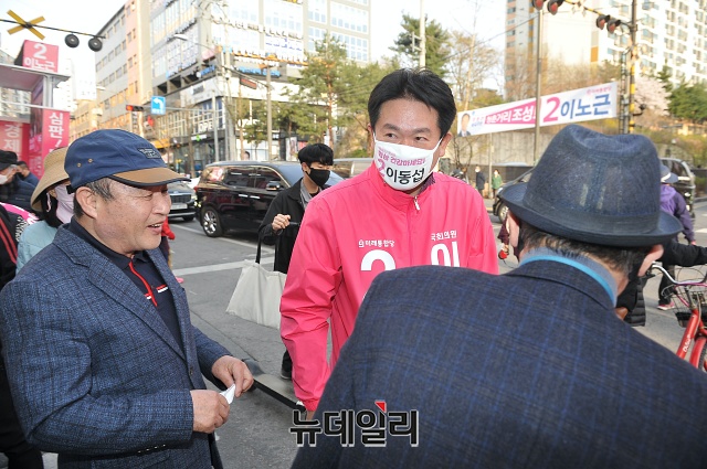 이동섭 미래통합당 노원을 후보가 6일 오후 서울 노원구 공릉동 인근에서 선거유세를 하고 있다.