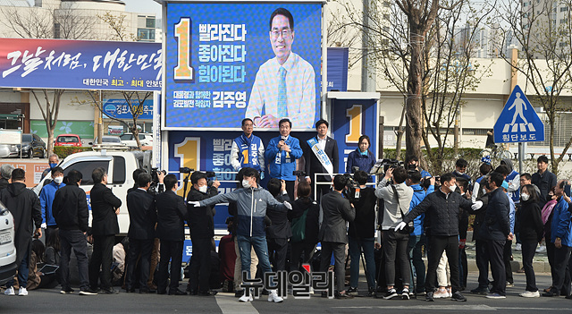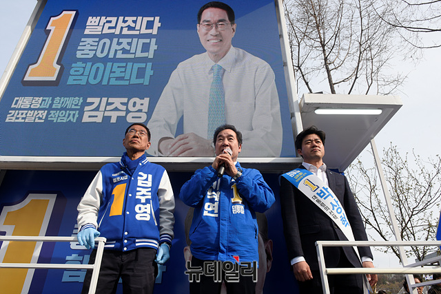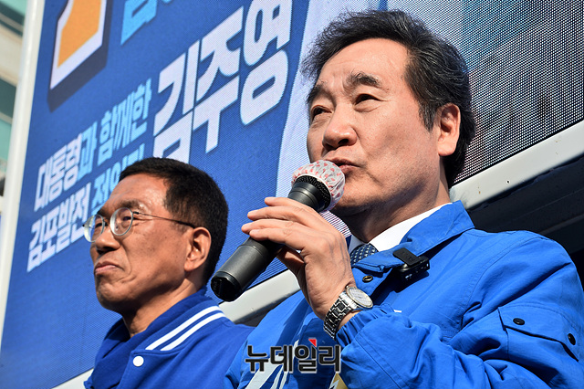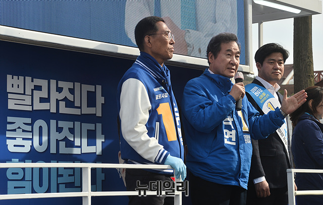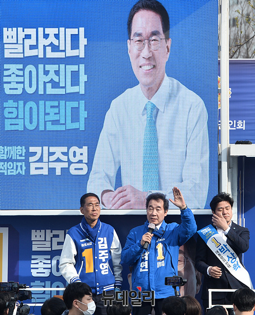이낙연 더불어민주당 공동상임선대위원장이 6일 오후 경기 김포시 사우역 운동장 앞 사거리에서 김주영 경기 김포시갑 후보, 박상혁 경기 김포시을 후보의 지지를 호소하고 있다. (경기 김포=박성원 기자)