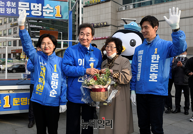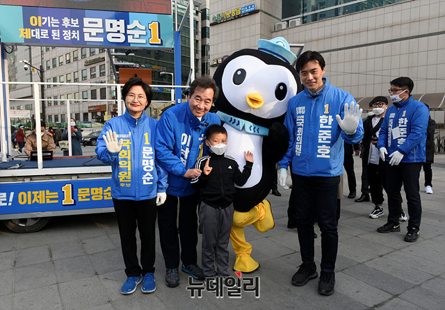 이낙연 더불어민주당 공동상임선대위원장이 6일 오후 경기 고양시 화정역 앞에서 문명순 경기 고양시갑 후보, 한준호 경기 고양시을 후보의 지원유세 후 시민들과 기념촬영을 하고 있다. (경기 고양=박성원 기자)