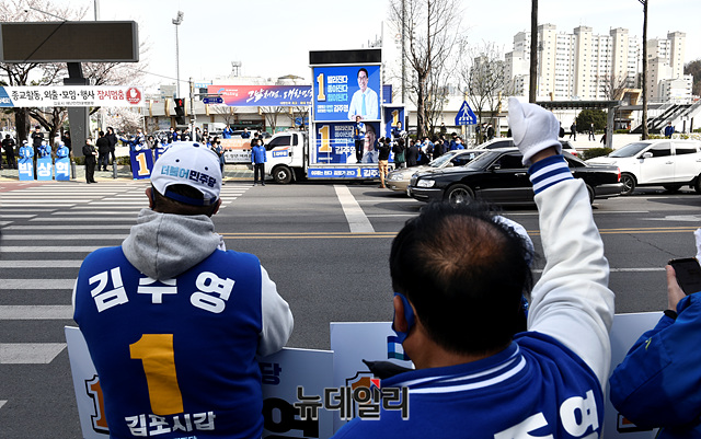 정부가 '코로나19(중국 우한 폐렴)'의 확산 방지로 '고강도 사회적 거리두기'를 요구하는 6일 오후 선거원들이 경기 김포시 사우역 운동장 앞 사거리에서 후보를 알리고 있다. (경기 김포=박성원 기자)