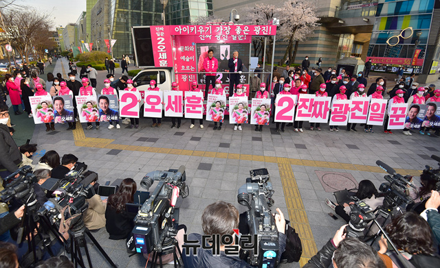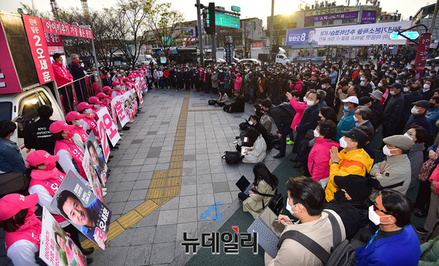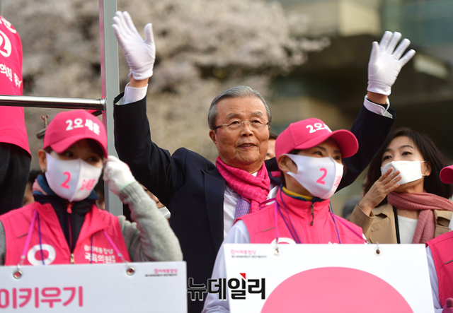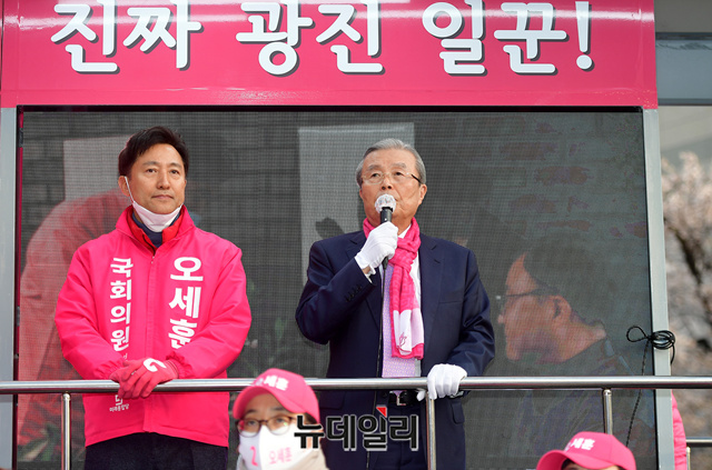 김종인 미래통합당 총괄선대위원장이 6일 오후 서울 광진구 롯데백화점 스타시티점 사거리를 방문해 오세훈 광진을 후보의 지원 유세를 하고 있다.