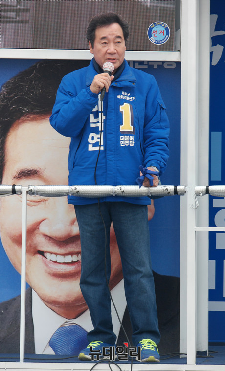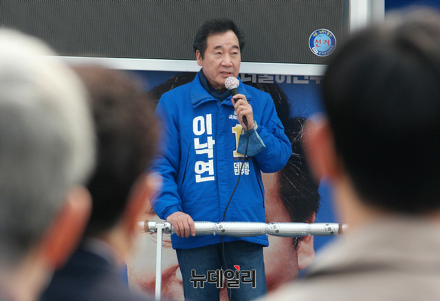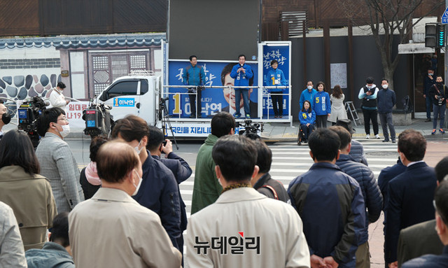 이낙연 더불어민주당 종로구 후보가 7일 오전 서울 종로구 재동초등학교 앞 거리에서 유세차량에 올라 지지를 호소하고 있다.