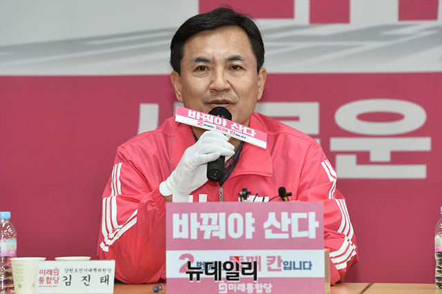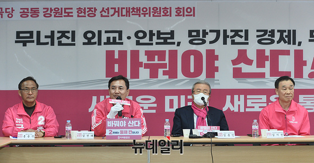 김진태 미래통합당 강원도선거대책위원장이 7일 오전 강원 춘천시 미래통합당 강원도당에서 열린 미래통합당·미래한국당 공동 강원권역 선대위 회의에서 발언을 하고 있다. (강원 춘천=박성원 기자)