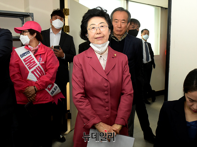 이은재 한국경제당 비례대표 후보가 7일 오전 강원 춘천시 미래통합당 강원도당에서 열린 미래통합당·미래한국당 공동 강원권역 선대위 회의장을 찾아 자리하고 있다. (강원 춘천=박성원 기자)