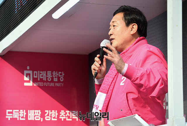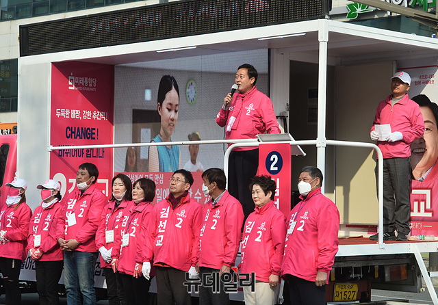 김선교 미래통합당 여주시양평군 후보가 7일 오후 경기 여주시 농협 여주시지부 앞에서 시민들에게 지지를 호소하고 있다. (경기 여주=박성원 기자)