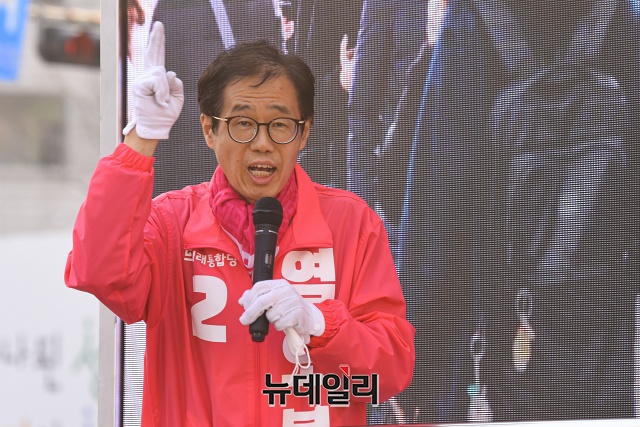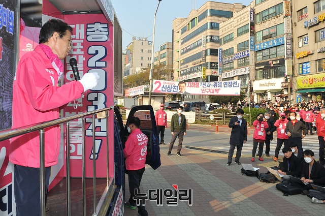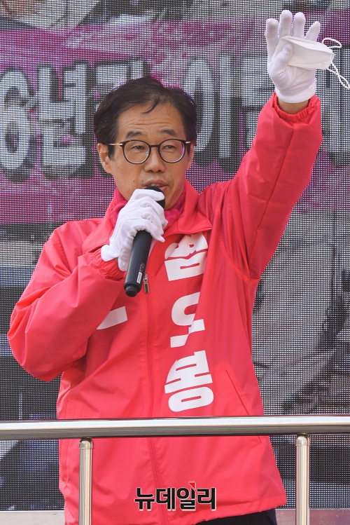 염오봉 미래통합당 성남시 수정구 후보가 7일 오후 경기 성남시 단대오거리역 광장에서 인사말을 하고 있다. (경기 성남=권창회 기자)