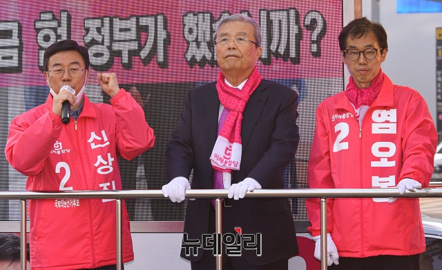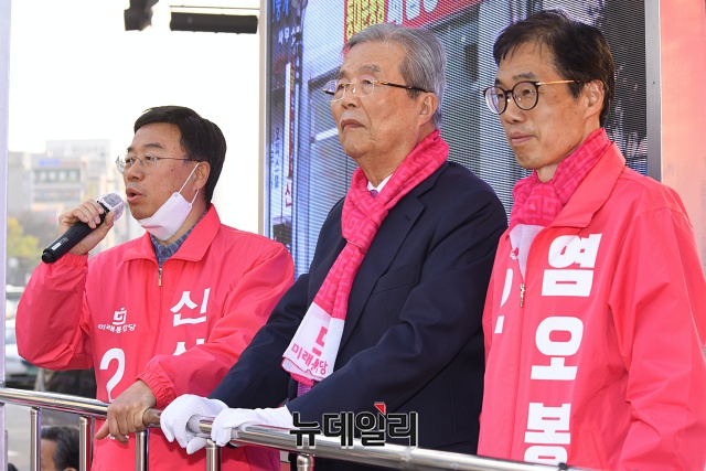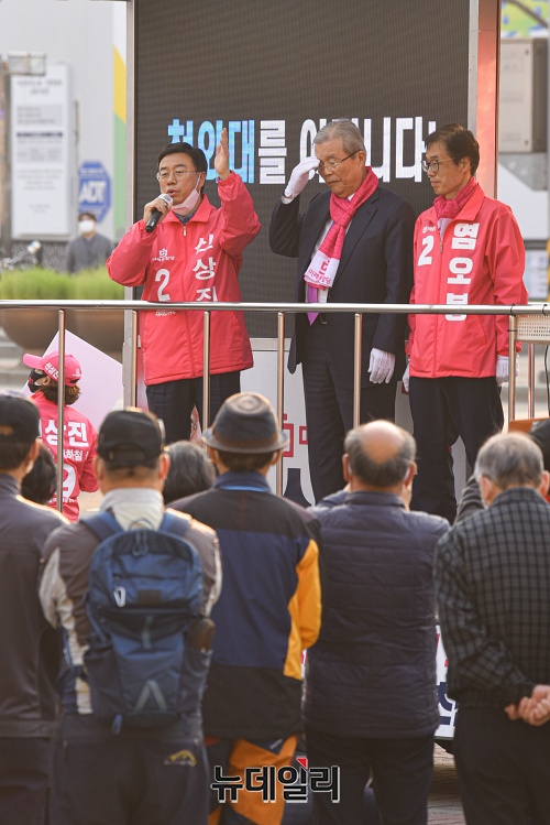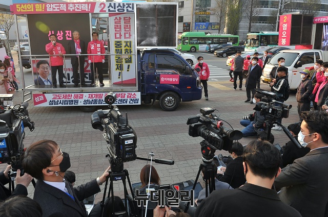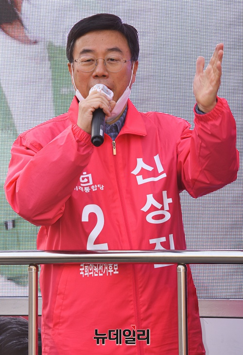 신상진 미래통합당 성남시 중원구 후보가 7일 오후 경기 성남시 단대오거리역 광장에서 지지호소를 하고 있다. (경기 성남=권창회 기자)