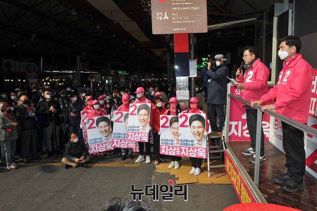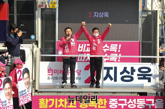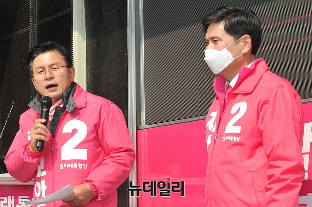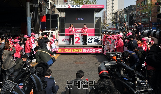 황교안 미래통합당 종로구 후보가 7일 오후 서울 중구 중앙시장에서 지상욱 중구성동구을 후보와 합동유세를 하고 있다.