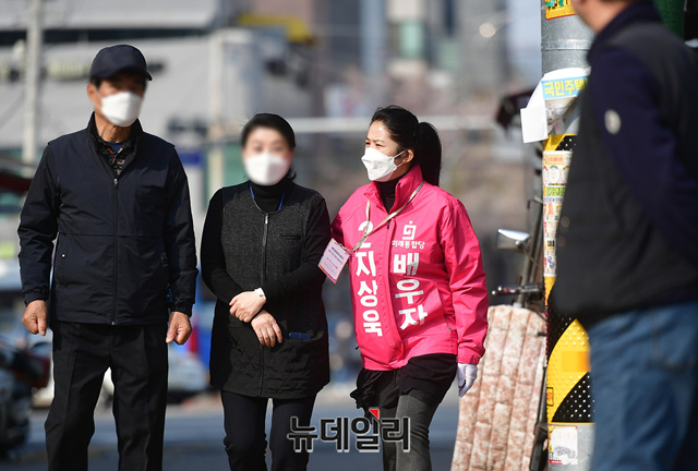 지상욱 미래통합당 중구성동구을 국회의원 후보의 아내 배우 심은하가 7일 오후 서울 중구 약수시장을 돌며 지 후보를 알리고 있다.