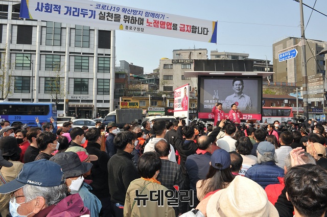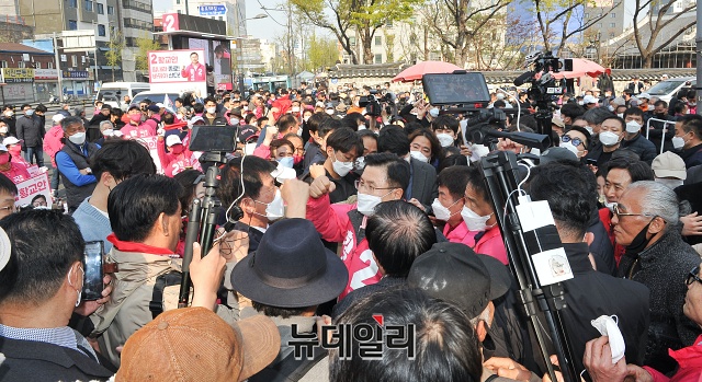 황교안 미래통합당 종로구 후보가 7일 오후 서울 종로구 동묘시장에서 황 대표를 지지하는 시민들에게 둘러싸여 있다.