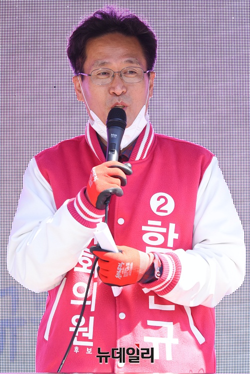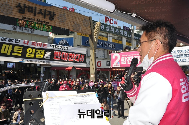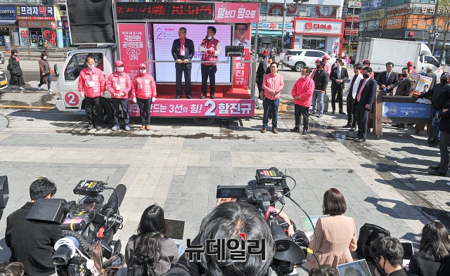 함진규 미래통합당 경기 시흥시갑 국회의원 후보가 8일 오전 경기 시흥시 삼미시장 앞에서 지지호소를 하고 있다. 이날 김종인 총괄선대위원장이 지원유세에 나섰다.(경기 시흥=권창회 기자)