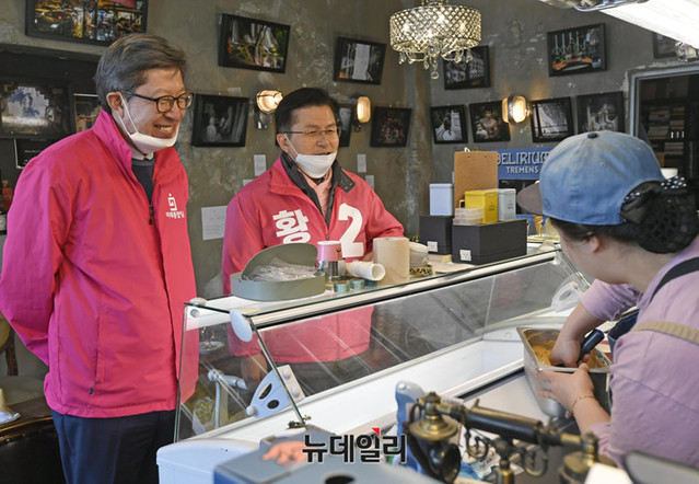 황교안 미래통합당 종로구 후보가 8일 오전 서울 종로구 옥인길 인근에서 시민들과 인사를 나누고 있다.