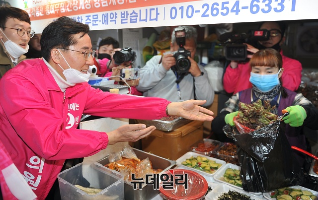 박경귀 미래통합당 아산시을 후보가 8일 오후 충남 아산시 온양전통시장에서 상인들과 대화를 나누고 있다. (충남 아산=권창회 기자)