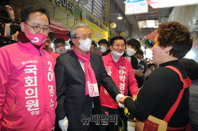 김종인 미래통합당 총괄선대위원장, 이명수 아산시갑 후보, 박경귀 아산시을 후보가 8일 오후 충남 아산시 온양전통시장에서 상인과 악수하고 있다. (충남 아산=권창회 기자)