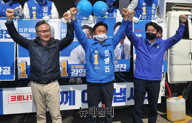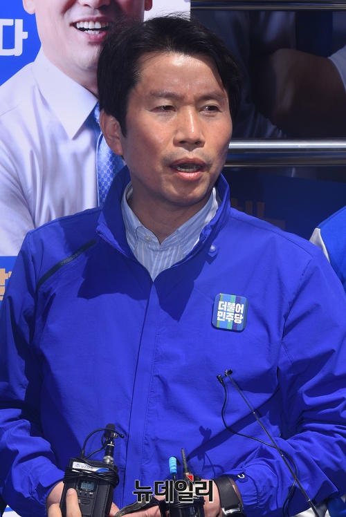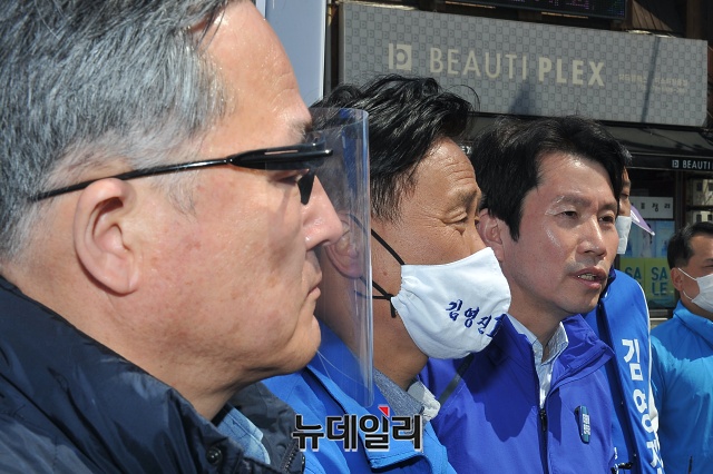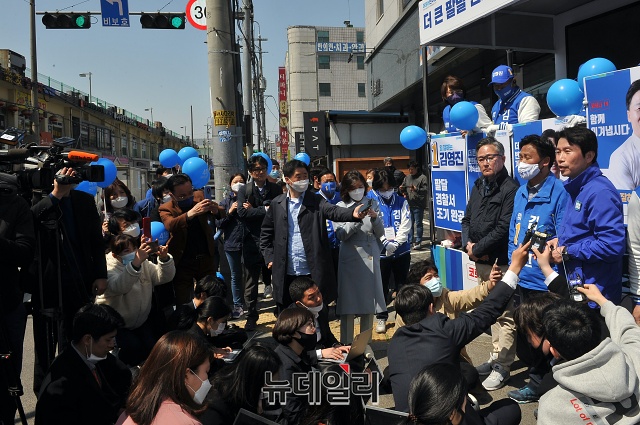 이인영 더불어민주당 공동선대위원장이 9일 오전 경기 수원시 화서시장 앞에서 김영진 수원병 후보의 지지호소를 하고 있다. (경기 수원=권창회 기자)