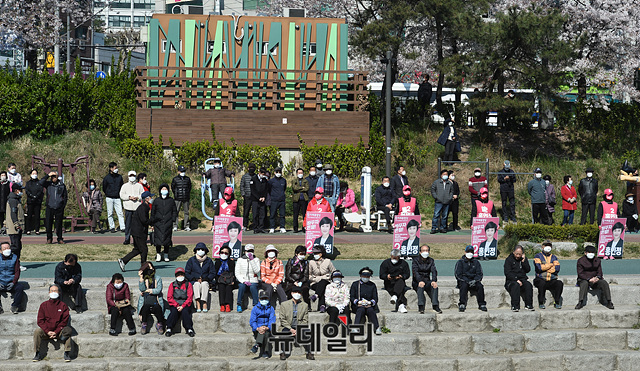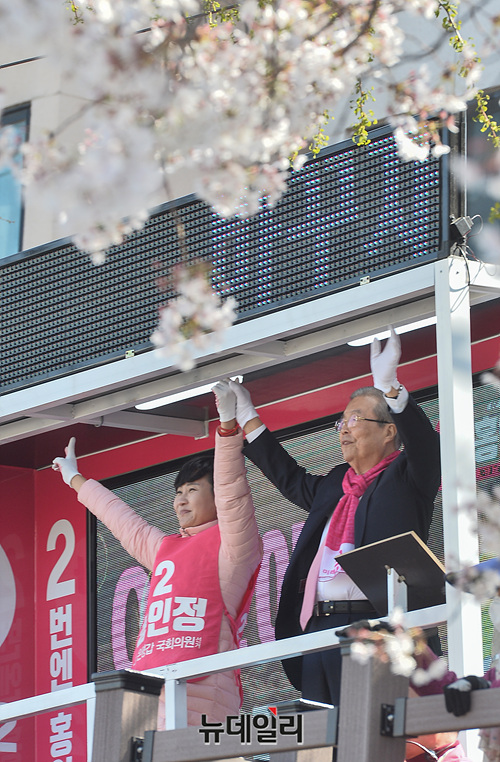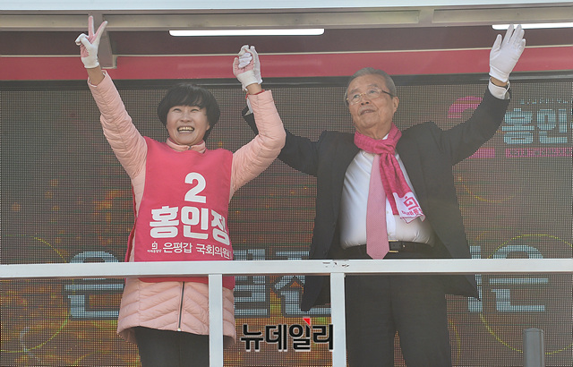 김종인 미래통합당 총괄선대위원장과 홍인정 은평구갑 후보가 9일 오전 서울 은평구 불광천 수변무대에서 손을 맞잡고 총선 승리를 다짐하고 있다.