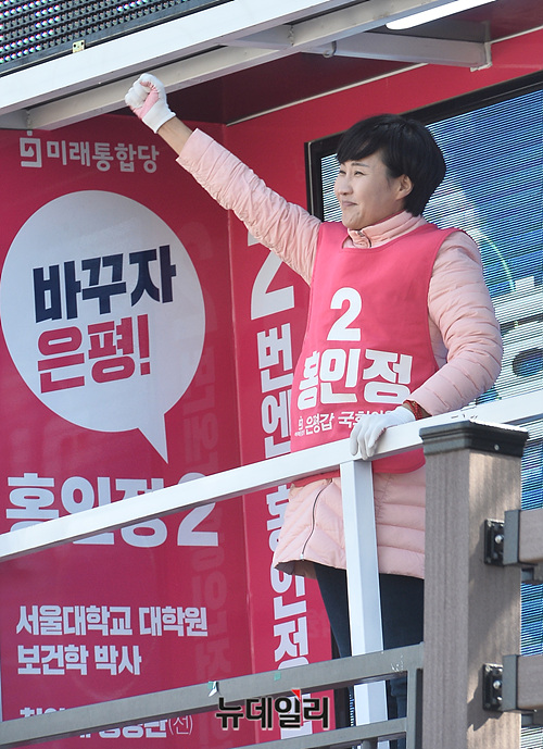 홍인정 미래통합당 은평구갑 후보가 9일 오전 서울 은평구 불광천 수변무대에서 지지를 호소하고 있다.
