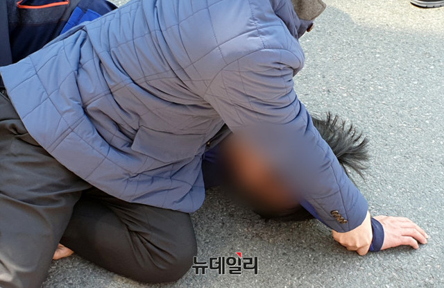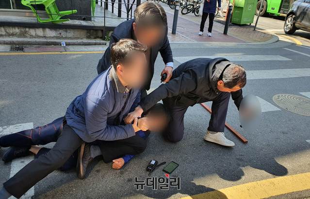 [포토] 오세훈 유세현장에 흉기 들고 접근...경찰이 제압