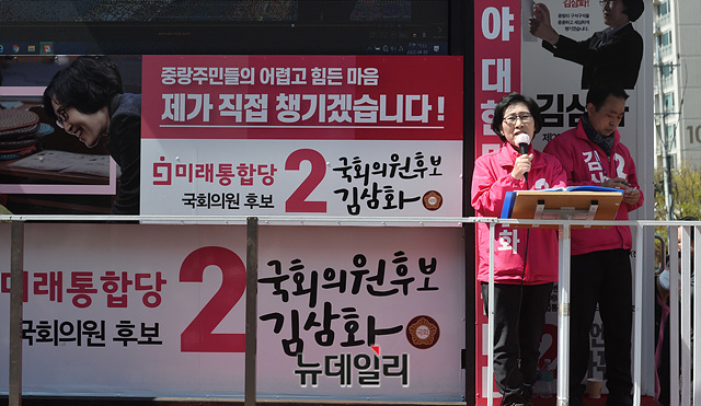 김삼화 미래통합당 중랑구갑 후보가 9일 오전 서울 중랑 상봉터미널 팔각정 앞에서 지지를 호소하고 있다.
