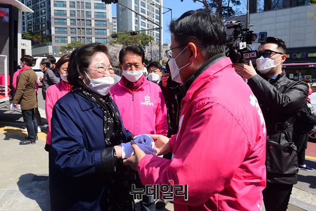 4.15 총선에서 서울 종로구에 출마한 황교안 미래통합당 대표가 9일 오전 서울 종로구 교남동 골목에서 김을동 전 의원과 인사를 나누고 있다.
